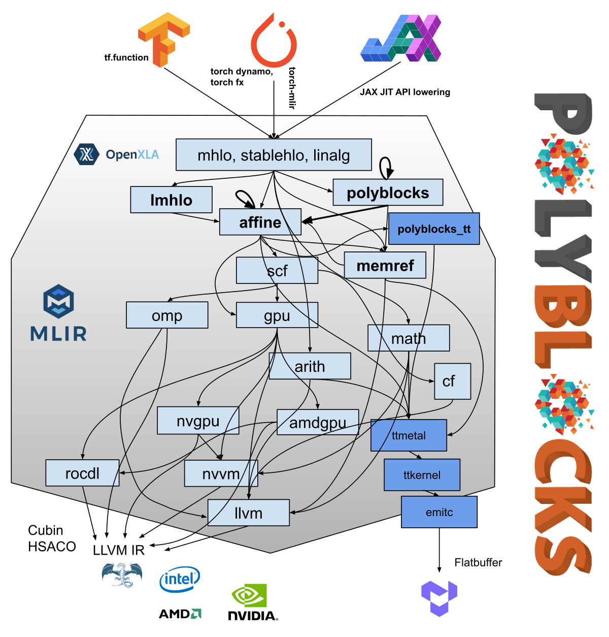 PolyBlocks is based on the MLIR infrastructure. It supports the popular AI programming frameworks like PyTorch, TensorFlow, and JAX, and multiple hardware targets including CPUs, NVIDIA GPUs, AMD GPUs, and Tenstorrent chips. PolyBlocks uses a combination of techniques on SSA and polyhedral optimization (where applicable) and is particularly powerful for computations on high-dimensional data spaces (tensors). Its optimization techniques encompass tiling, fusion, performing recomputation (in conjunction with tiling and fusion), packing into on-chip buffers for locality, eliminating intermediate tensors or shrinking intermediate tensors to bounded buffers fitting into on-chip memory, mapping to matmul/tensor cores, and efficient parallelization in a way unified with all other transformations. Its code generation pipeline includes the above-mentioned optimization techniques packaged into “compiler passes” or utility libraries. It can thus be easily used to build new PolyBlocks-powered compilers for new hardware or new programming frameworks.